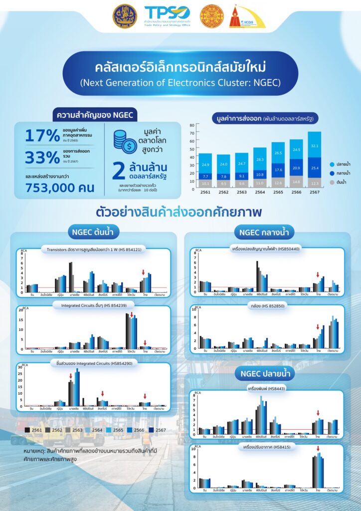 1. อุตสาหกรรมอิเล็กทรอนิกส์สมัยใหม่ (NGEC): ได้แรงหนุนจากการย้ายฐานการผลิตโลกและความตึงเครียดภูมิรัฐศาสตร์ ไทยมีโอกาสพัฒนา ICs และชิ้นส่วนอิเล็กทรอนิกส์ รัฐควรส่งเสริมการสร้างห่วงโซ่อุปทานในประเทศ ควบคู่ยุทธศาสตร์ระดับชาติ การเข้าถึงแหล่งทุน และการจัดซื้อภาครัฐ