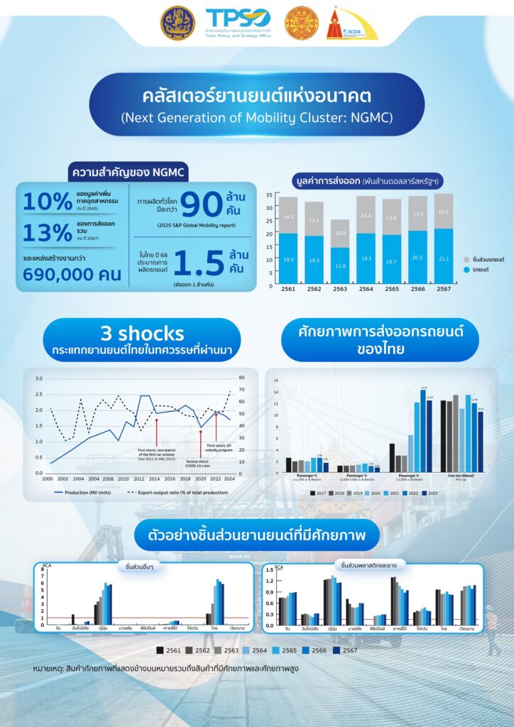 2. ยานยนต์แห่งอนาคต (NGMC): ไทยยังเป็นฐานผลิตและส่งออกรถยนต์สำคัญ แต่เผชิญการแข่งขันจาก BEV การส่งออกจึงเป็นทางออกหลัก โดยต้องลดต้นทุน เพิ่มมาตรฐาน สนับสนุนเงินทุน และต่อยอดสู่ตลาด REM รวมถึงชิ้นส่วน Smart Auto Parts ที่เชื่อมโยง NGMC–NGEC